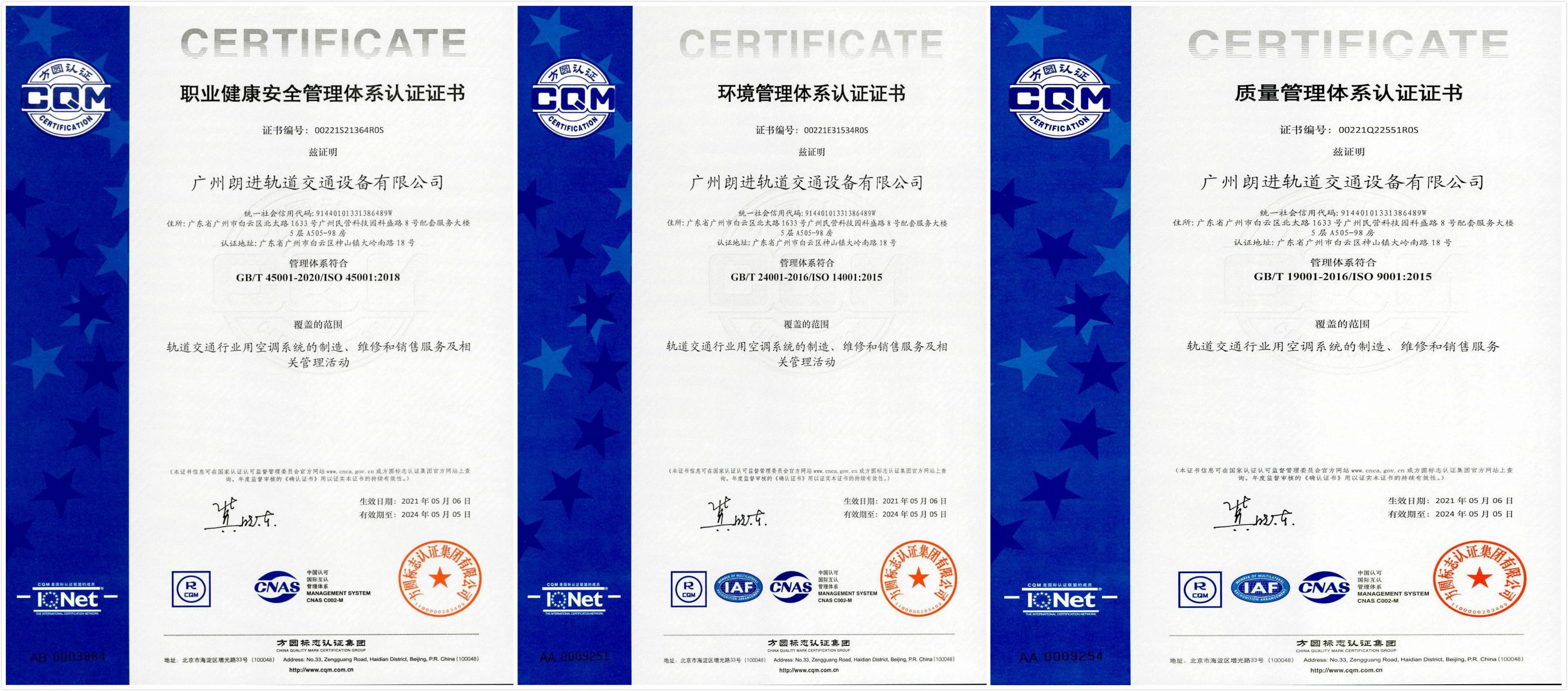 2021年5月,公司全资子公司广州朗进轨道交通设备有限公司(以下简称广州朗进)顺利通过ISO三大管理体系认证,荣获ISO9001质量管理体系、ISO14001环境管理体系、ISO45001职业健康安全管理体系认证证书,标志着广州公司的管理更加标准化、规范化,为广州公司的持续健康发展奠定了坚实的基础。