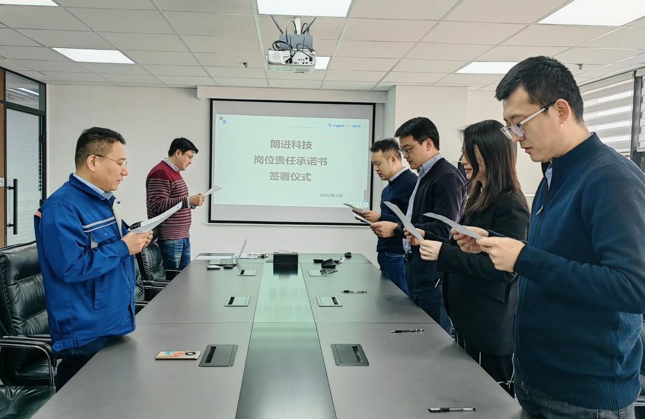 为明确工作职责,强化执行落实,确保朗进科技2022年度各项工作有序高效推进。基于疫情原因,自3月21日起,由人力行政部组织,各中心各部门负责人分批在青岛软件园20层会议室和莱芜工业园会议室参加了2022年度岗位责任承诺书签订仪式,公司总经理李敬恩全程参与。