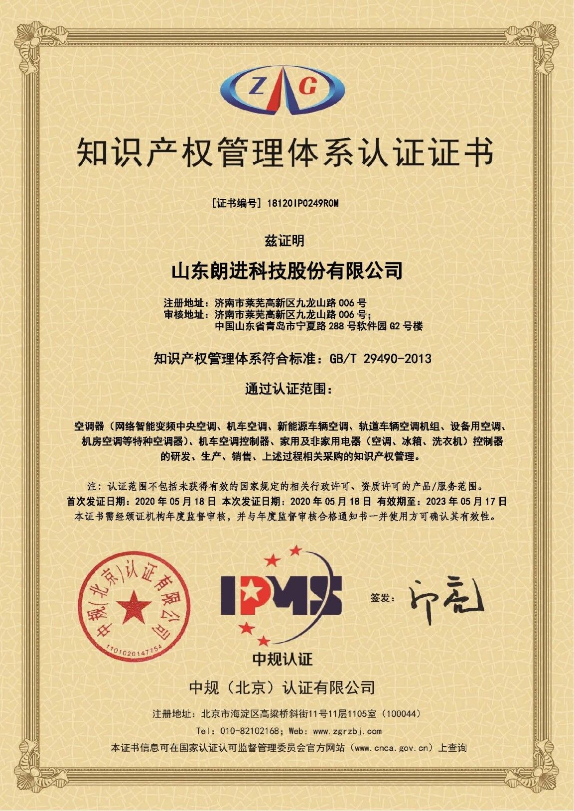朗进科技于2020年05月18日正式获得中规(北京)认证有限公司颁发的《知识产权管理体系认证证书》(证书编号:18120IP0249R0M)。