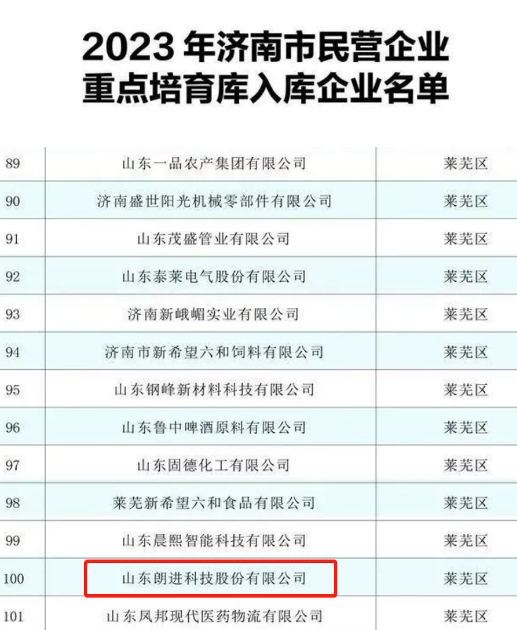 为突出政策的导向性,济南市建立了全市民营企业重点培育库,从在本地注册独立核算的民营企业中,筛选出以四大主导产业和制造业为主、年销售收入过5亿元的企业108家,服务业和建筑业年销售收入过30亿元的企业 24 家以及有市重大建设项目且总投资过3亿元的38 家制造业企业,纳入培育库,入库企业共计 170家,将在《若干措施》中给予重点支持。朗进科技凭借自身优势被纳入2023济南市莱芜区民营企业重点培育库。