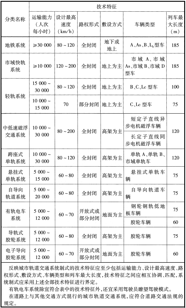 城市轨道交通按照系统制式划分为地铁系统、市域快轨系统、轻轨系统、中低速磁浮交通系统、跨座式单轨系统、悬挂式单轨系统、自导向轨道系统、有轨电车系统、导轨式胶轮系统、电子导向胶轮系统十类,各分类的技术特征见下表: