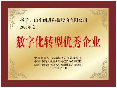 3月10日上午,以聚焦新质生产力主攻方向,实现走在前列、开创未来为议题,全国首场机器人与高端装备新质生产力发展峰会,在第十九中国(山东)国际装备制造业博览会开幕之际隆重举行。朗进科技受邀参会并荣获“数字化转型优秀企业”荣誉称号。
